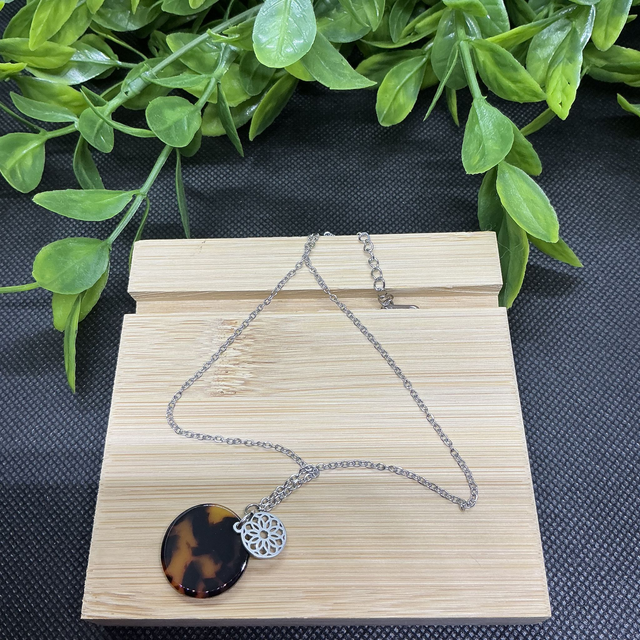 Il présente un pendentif double couche : un large disque au motif d'écaille de tortue marron/ambre et un médaillon ajouré en forme de fleur en acier inoxydable argenté.
